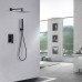 Душевая система Abber Daheim AF8219B.Характеристики: Цвет: черный матовый. Материал: латунь. Управление: однорычажное. Диаметр верхнего душа: 250 x 250 мм. Форма верхнего душа: квадратная. Количество режимов ручного душа...
