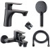 Душевой гарнитур. Трехрежимная душевая лейка с форсунками против известковых отложений. Душевой шланг длиной 150 см. Размер душевого диска: 11 см. Держатель настенный с 6 углами наклона. Смеситель для ванны. Керамический картридж обеспечивает надежность управления потоком и температурой воды. Автоматический переключатель: ванна/душ. Стандарт подключения: G 1/2. Смеситель для раковины. Керамический картридж. Система быстрого монтажа. Однорычажная система управления. Монтаж на одно отверстие. Излив фиксированный с аэратором. В комплекте поставки: душевой гарнитур, смеситель для ванны, смеситель для раковины, гибкая подводка.