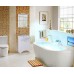 Яркие акценты тумбы - белоснежный фигурный фасад с оригинальной отделкой снизу и круглые хромированные ручки на распашных дверцах.